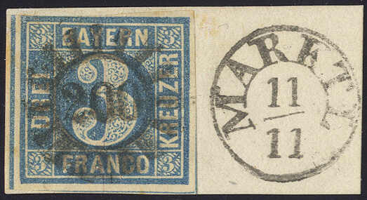 | Zusatzinformationen und Suchstichworte: | 70. Deider Auktion Auktionstermin: 20. Mai 2022 Los 2040 Altdeutschland Bayern 3 Kr. blau, Pl. 1 (links Randlinienschnitt), auf Luxus-Briefstück mit zentrischem Stpl. "200" und Fingerhutstpl. "MARKTL", Fotobefund Brettl BPP. Zuschlag 220,00 EUR |