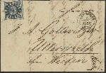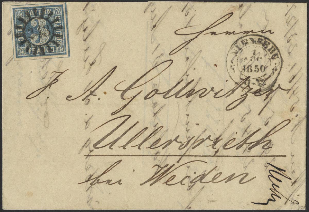 | Zusatzinformationen und Suchstichworte: | 70. Deider Auktion Auktionstermin: 20. Mai 2022 Los 2047 Altdeutschland Bayern 3 Kr. blau, Pl. 1, Luxusstück mit allen vier Trennlinien auf kpl. Brief mit Ersttags-Mühlradstempel "243" NÜRNBERG 1. AUG. 1850, Fotoattest Brettl BPP. Zuschlag 600,00 EUR |