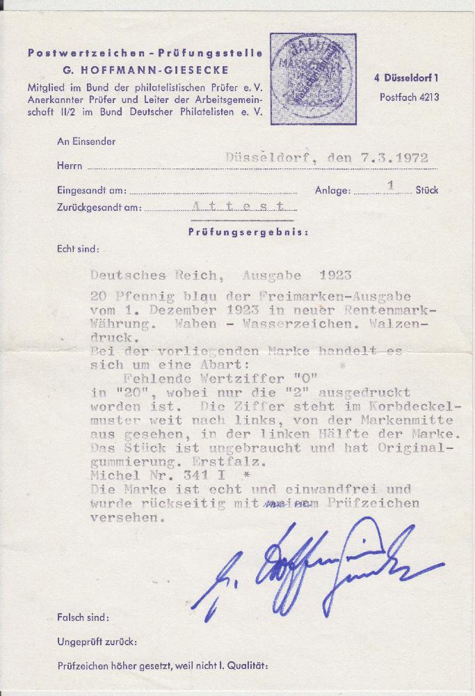 | Prüfgebiet: | Deutsches Reich 1919 - 1923 (Mi-Nr. 107 - 343) |