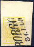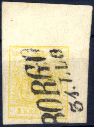 | Zusatzinformationen und Suchstichworte: | 73. Viennafil Live-Auktion Auktionstermin: 31. Mai - 3. Juni 2022 Los 2161 Österreich Abstempelungen Tirol 1850, 1 Kreuzer kadmiumgelb Type III auf Maschinenpapier, rechtes Eckrandstück 12,2:5,6mm, gestempelt Borgo 31.LUG21.5., Luxus, Befund Weissenbichler, ANK 1 III MP / Fe. 1.600,-++ Zuschlag 800,00 EUR |