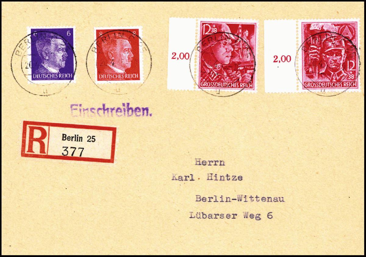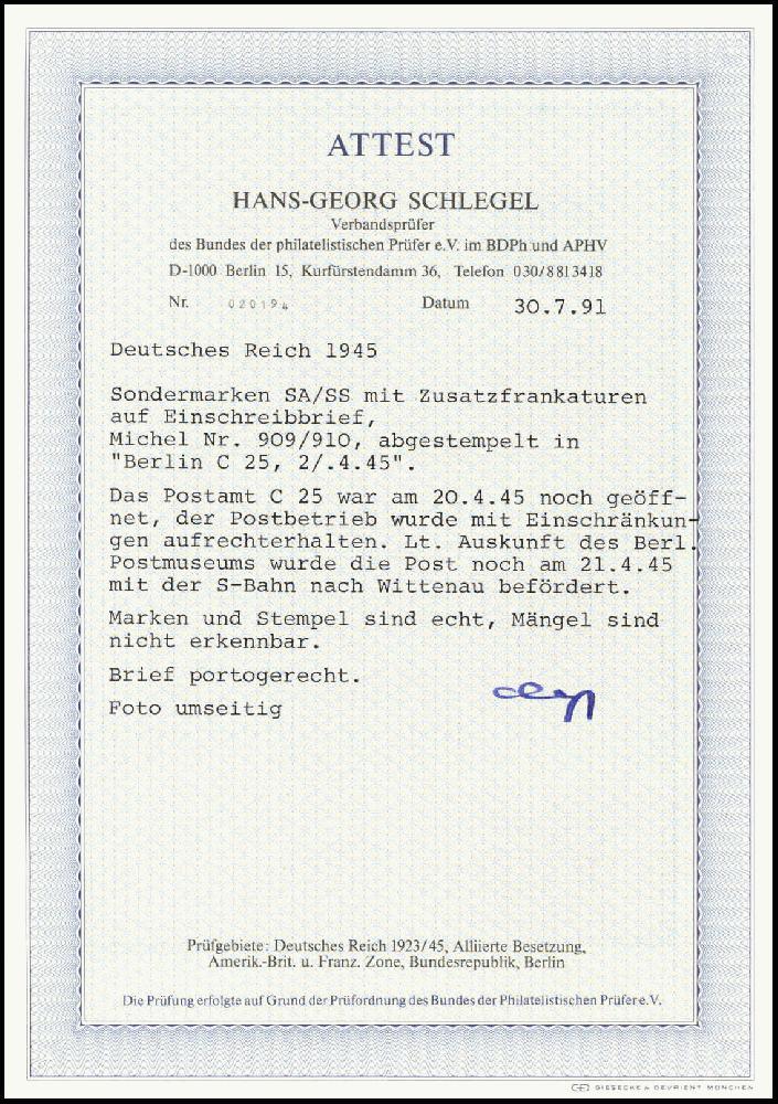 | Zusatzinformationen und Suchstichworte: | Württembergisches Auktionshaus 140. VersteigerungAuktionstermin: 17. - 18. Juni 2022 Los 4598 Deutsches Reich, 1933/45 Drittes Reich SA/SS mit Zusatzfrankatur Hitler 6 und 8 Pfg. auf tadellosem, tarifmäßig frankiertem Orts-Einschreibebrief mit klaren Stempeln BERLIN C25 20/4 45 nach Berlin-Wittenau mit rs. Ak.-Stempel vom 21.4.45, Fotoattest H.G.Schlegel BPP: "Das Postamt C25 war am 20.4.45 noch geöffnet, der Postbetrieb wurde mit Einschränkungen aufrecht erhalten. Lt. Auskunft des Berliner Postmuseums wurde die Post noch am 21.4.45 mit der S-Bahn nach Wittenau befördert". Zuschlag 1.050,00 EUR |