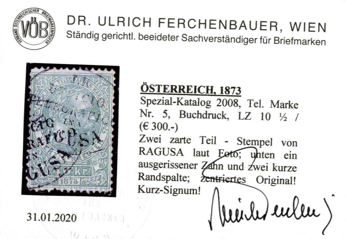 | Zusatzinformationen und Suchstichworte: | 73. Viennafil Live-Auktion Auktionstermin: 31. Mai - 3. Juni 2022 Los 2776 Österreich Abstempelungen Dalmatien 1873, 40 Kr. Telegrafenmarke im Buchdruck in Zähnung 10 1/2, gestempelt RAGUSA, Zahnfehler, Befund Dr. Ferchenbauer, ANK 5 / 280,- Ausruf 50,00 EUR |
