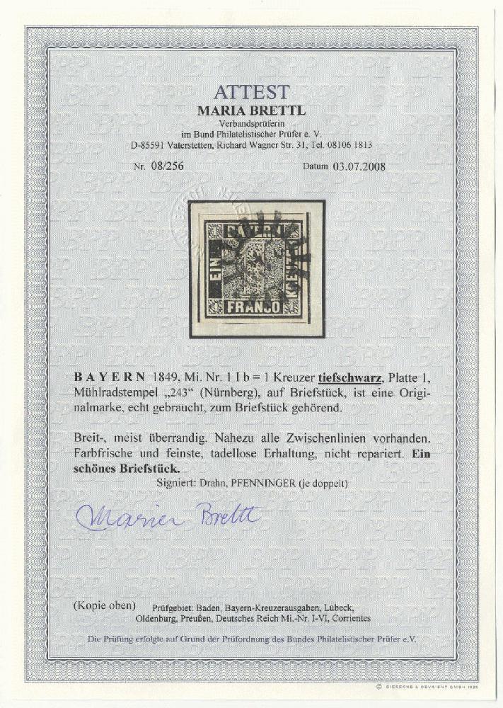 | Zusatzinformationen und Suchstichworte: | 70. Deider Auktion Auktionstermin: 20. Mai 2022 Los 2025 Altdeutschland Bayern 1 Kreuzer tiefschwarz, Platte 1, Luxus-Briefstück mit fast allen Trennlinien und Mühlradstempel "243" (Nürnberg), Fotoattest Brettl BPP. Zuschlag 1.650,00 EUR |