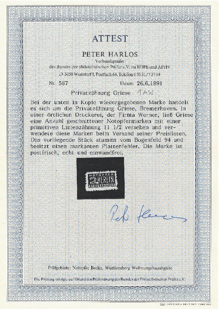 | Zusatzinformationen und Suchstichworte: | Privatzähnung des Briefmarkenversands Griese in Bremerhaven. Zähnung erfolgt durch die örtliche Druckerei Werner mit der LZ 11 1/2. Die Griese-Zähnung ist eine der wenigen Privatzähnungen, die auch postfrisch - wenn auch in verschwindend geringer Menge - bekannt geworden ist. |