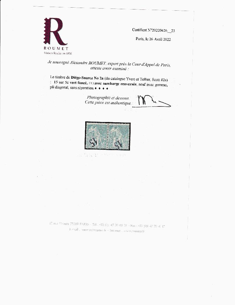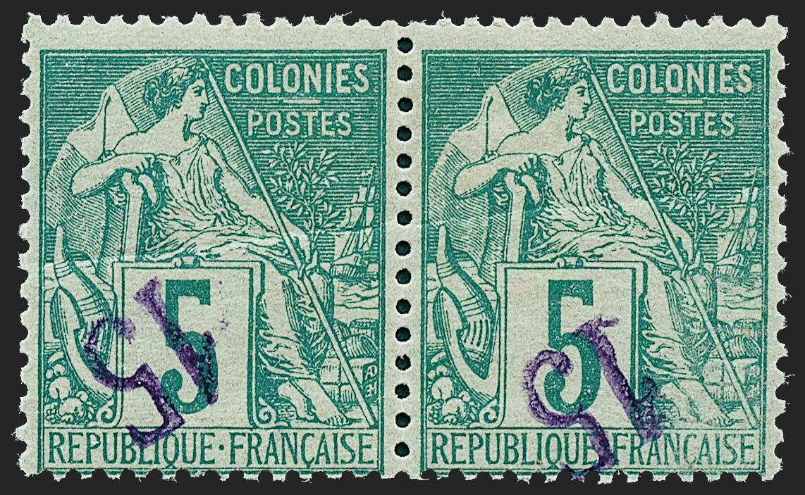 | Zusatzinformationen und Suchstichworte: | Robert A. Siegel - Worldwide Stamps and Postal History Auktionstermin: 21. - 23. Juni 2022 Los 4813 Diego Suarez DIEGO-SUAREZ, 1890, 15c auf 5c grün auf grünlich, kopfstehender Aufdruck (2a; Yvert 2a). Waagrechtes Paar, Originalgummi, kräftige Farbe, Querbug, fein, ein seltener Fehler Einheit, signiert Bernichon und mit 2022 Roumet Attest, Katalog Werten als zwei Einzelmarken, Scott $2,400,00, Yvert € 3,000 Ausruf 400,00 USD |