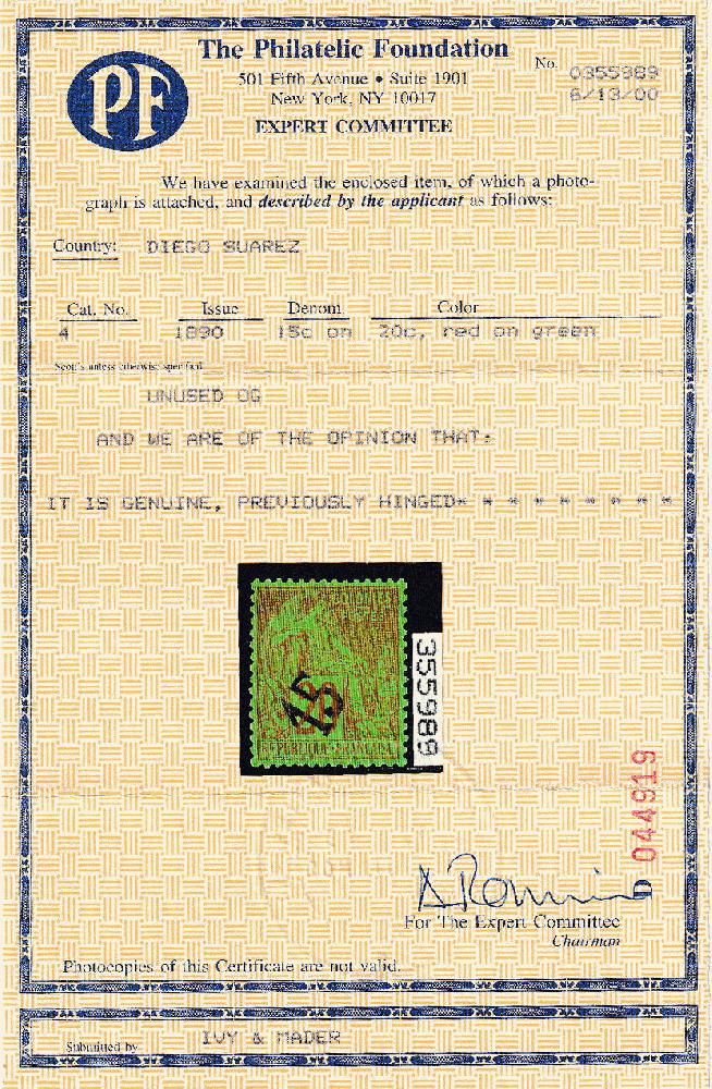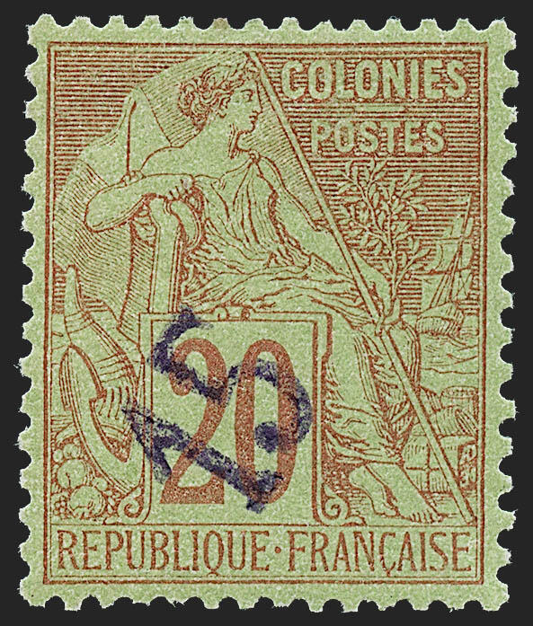 | Zusatzinformationen und Suchstichworte: | Robert A. Siegel - Worldwide Stamps and Postal History Auktionstermin: 21. - 23. Juni 2022 Los 4073 Diego Suarez DIEGO-SUAREZ, 1890, 15c auf 20c rot auf grün (4; Yvert 4). Originalgummi, gut zentriert, leuchtende Farben, Pracht, nur 185 gedruckt, signiert Bernichon und Thiaude, mit 2000 P. F. Attest, Scott $650,00, Yvert € 900 Ausruf 200,00 USD |