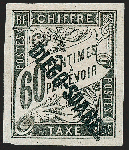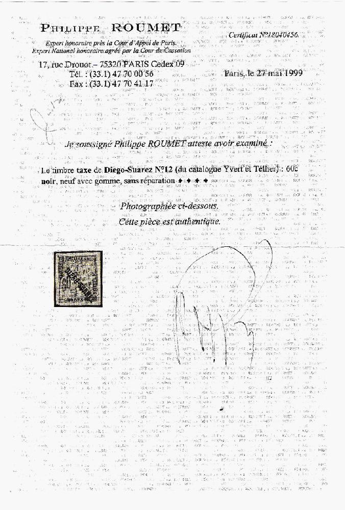 | Zusatzinformationen und Suchstichworte: | Robert A. Siegel - Worldwide Stamps and Postal Histor Auktionstermin: 21. - 23. Juni 2022 Los 4079 Diego Suarez DIEGO-SUAREZ, 1892,60c schwarz, Nachgebühr (J12; Yvert TT12). Originalgummi, breite Ränder, scharfer Druck, Pracht, nur 150 gedruckt, mit 1999 Roumet und 2005 Calves Zertifikaten, Scott $1,200,00, Yvert € 1,350 Ausruf 400,00 USD |