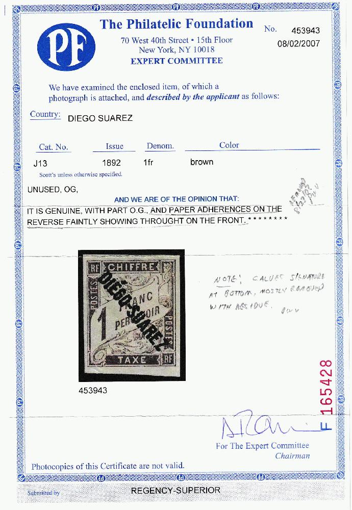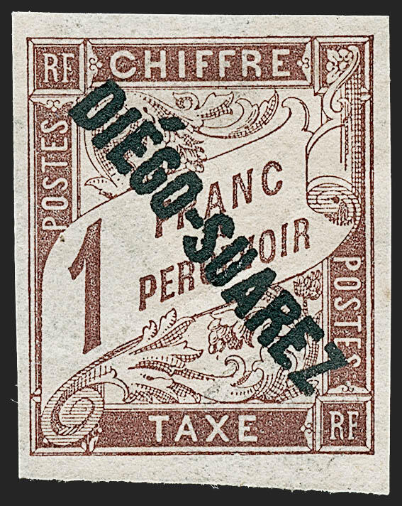 | Zusatzinformationen und Suchstichworte: | Robert A. Siegel - Worldwide Stamps and Postal History Auktionstermin: 21. - 23. Juni 2022 Los 4080 Diego Suarez DIEGO-SUAREZ, 1892,1 Fr. braun, Nachgebühr (J13; Yvert TT13). Teiloriginalgummi, voll- bis breitrandig, kräftige Farbe, Attest vermerkt Papieranhaftungen auf Rückseite, welches wurden entfernt (und in herausnehmend sie ein Teil der Calves rückseitiger Stempel war sowie entfernt), Pracht, eine seltene Portomarke, mit 2007 P. F. Attest, Scott $2,800,00, Yvert € 3,500 Ausruf 750,00 USD |