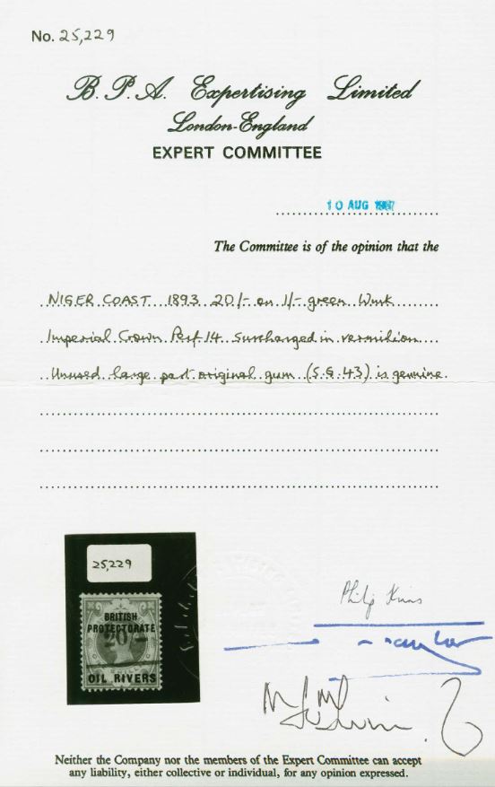 | Zusatzinformationen und Suchstichworte: | Ubersetzung: Das Komitee ist der Meinung, dass die NIGER COAST 1893 20/- grün Imperial Crown Part 14 Zuschlag in Zinnoberrot, ungebraucht ..... original Gummi ( S.G. 43) echt ist. |