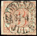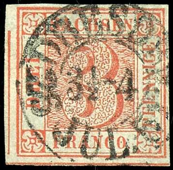 | Zusatzinformationen und Suchstichworte: | Dr. Reinhard Fischer 186. Auktion Auktionstermin: 18. - 21. Mai 2022 Los 1574 Altdeutschland Sachsen 3 Pfennig ziegelrot sog. Sachsendreier, sächsisches Liniensystem, entwertet mit Zweikreisstempel "Dresden 25 Jul 51", optisch ansprechend - wenn auch repariertes (Papier oben und rechts rückseitig verstärkt sowie rechts zwei Spaltrisse) Exemplar, Fotoattest Hunziker, Mi. 8.000.- Zuschlag 1.450,00 EUR |