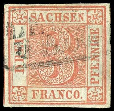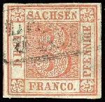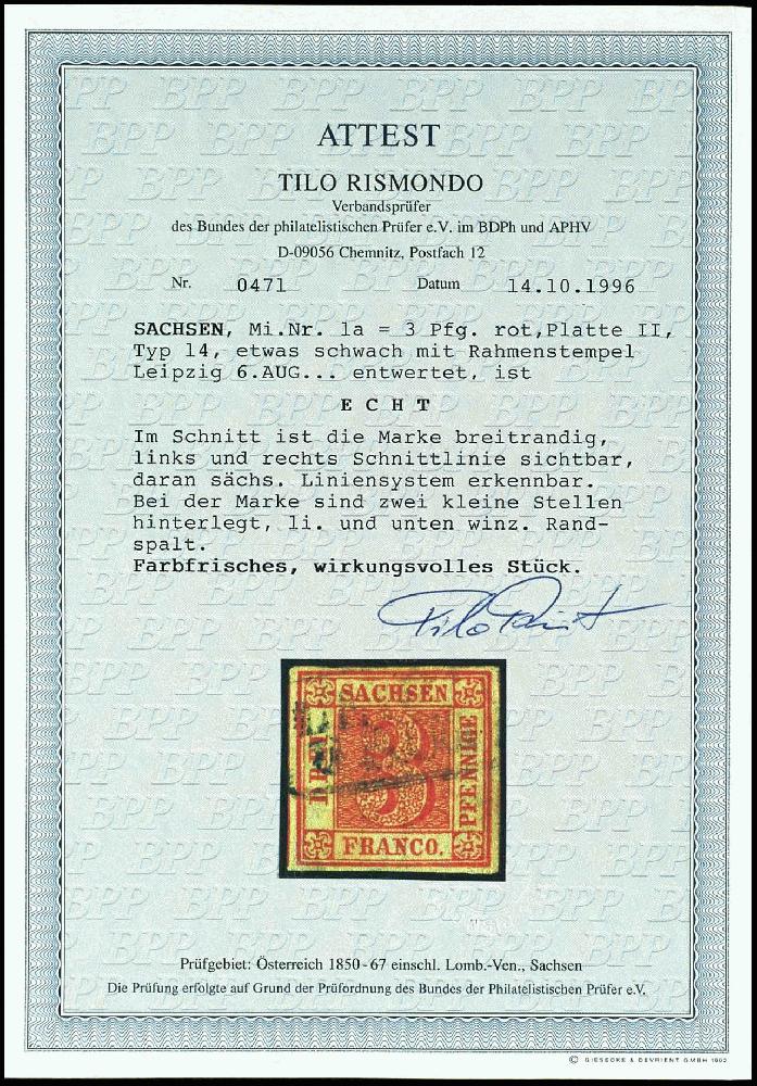 | Zusatzinformationen und Suchstichworte: | Dr. Reinhard Fischer 186. Auktion Auktionstermin: 18. - 21. Mai 2022 Los 1575 Altdeutschland Sachsen 3 Pfg rot, Platte II, Typ 14, allseits breitrandig, links und rechts mit Schnittlinien, daran sächs. Liniensystem erkennbar, mit Rahmenstempel "LEIPZIG 6 AUG" entwertet, zwei kleine Stellen hinterlegt, links und unten winziger Randspalt, farbfrisches und wirkungsvolles Stück, Fotoattest Rismondo BPP, Mi. 8.500.- Zuschlag 1.800,00 EUR |