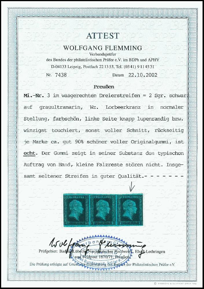 | Zusatzinformationen und Suchstichworte: | Der Dreierstreifen des Attests war ein Teil des Angebots. Dr. Reinhard Fischer 186. Auktion Auktionstermin: 18. - 21. Mai 2022 Los 1440 Altdeutschland Preussen 1/2 Sgr, 1, 2 und 3 Sgr tadellos ungebraucht mit Originalgummi, für Mi-Nr. 3 Fotoattest Flemming BPP (für 3er-Streifen) und Mi-Nr. 4a tiefst gepr. Brettl BPP, Mi. 660,-- Ausruf 150,00 EUR |