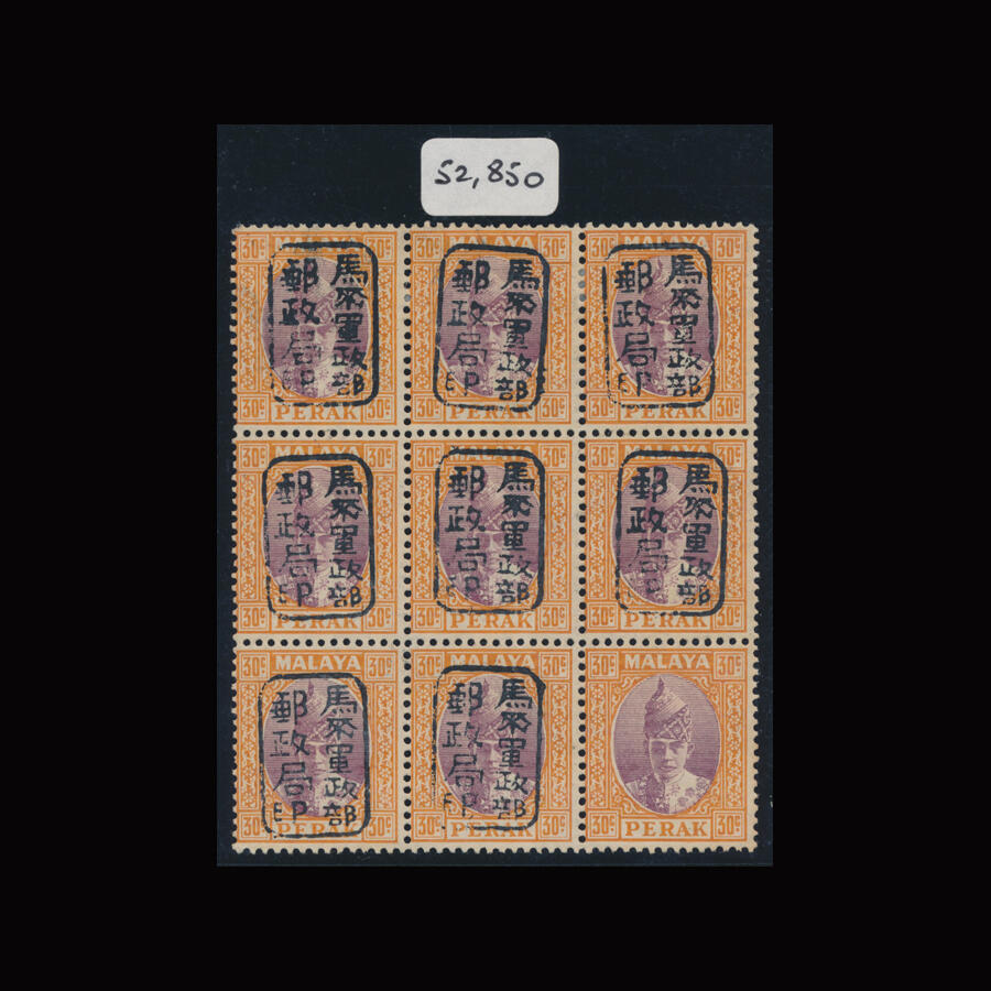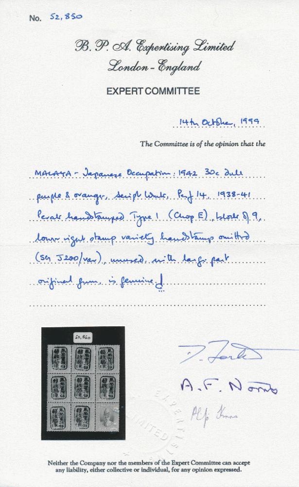 | Zusatzinformationen und Suchstichworte: | Doreen Royan & Associates Shop - Online Los 750792 (D) Japan Besetzung II. WK Malaya Malaya/Japanese Occupation 1942 King George VI Japanese Occupation of Perak. 30c. dull purple and orange. Handstamped with Type 1. Block of nine. Variety, ‘Lower right stamp has Handstamp omitted’. Superb mint and superb unmounted mint condition. British Philatelic Association Certificate No. 52,850 (1999). EXCEEDINGLY RARE AND IMPORTANT Festpreis 2.250,00 GBP |