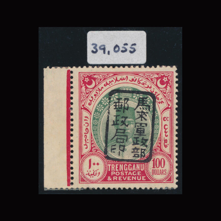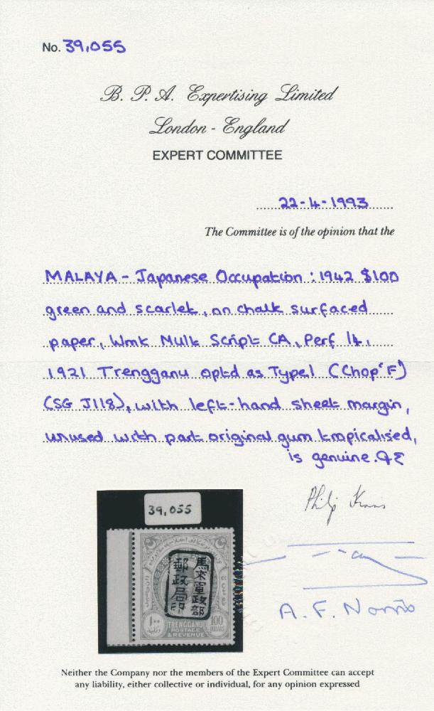 | Zusatzinformationen und Suchstichworte: | Doreen Royan & Associates Shop - Online Los 751181 (D) Japan Besetzung II. WK Malaya Gesamt AusgabeMalaya/Japanese Occupation 1942 King George VI $100 green and scarlet. Left marginal example. Superb mint condition (with usual tropicalised gum). British Philatelic Association Certificate No. 39,055 (1993). EXCEPTIONALLY RARE Festpreis 2.500,00 GBP |