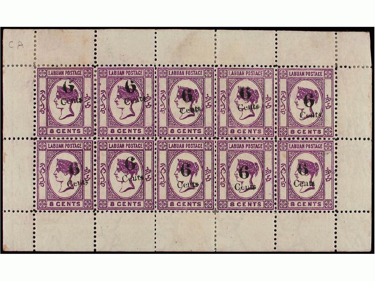 | Zusatzinformationen und Suchstichworte: | Soler y Llach - 777. Auktion - Stamps and Covers of the World Los 705 LabuanLABUAN. 1891-92,6 cents. Auf 8 cents. Tiefviolett, Zehnerbogen. Leicht getönt Gummi und kleinere Oberfläche Altersflecken. Attest R. P. S. Sg. 34. Stanley Gibbons. + 2,000£.; Ausruf 600,00 EUR |