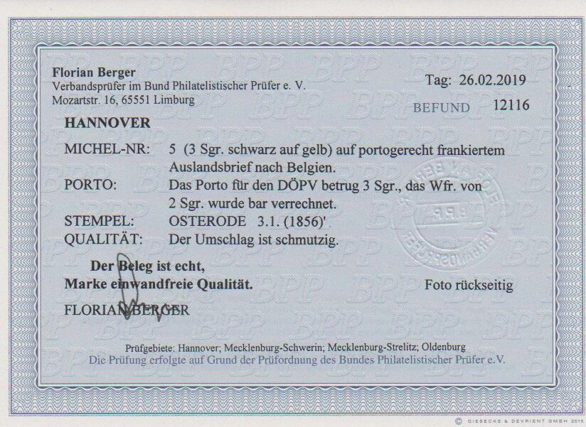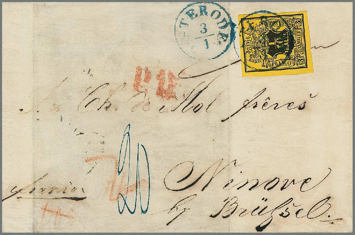 | Zusatzinformationen und Suchstichworte: | Rauhut & Kruschel - 212. Auktion Auktionstermin: 30. Juli 2022 Los 755 Altdeutschland Hannover 1/10 Th. schw./gelb, breitrandig und tadellos, auf etwas schmutzigem Faltbrief mit K1 "Osterode" 1856 nach Ninove/Belgien. Teilfranko bis zur Postvereinsgrenze, restliches Porto von 2 Sgr. (hs. "20" Cent) bar erhoben. Fotoexp. Berger |