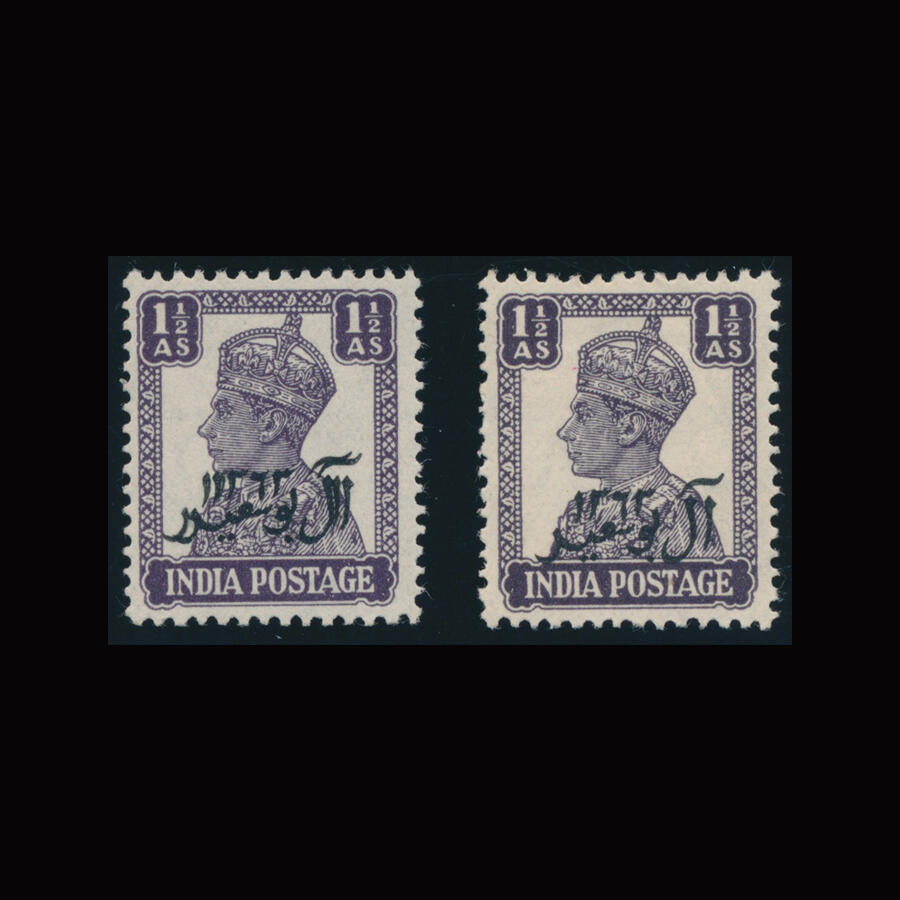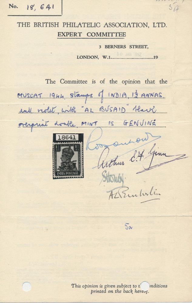 | Zusatzinformationen und Suchstichworte: | Doreen Royan & Associates Shop - Online Los 751261 (D) Oman British Postal Agencies in Eastern Arabia/Muscat 1944 King George VI 1 1/2a. Al-Busaid. Variety, ‘Overprint double’. Superb unmounted mint condition (with normal for comparison). British Philatelic Association Certificate No. 18,641 (1952) and KGVI Expertising Certificate No. 1439/10-11 (2011). OUTSTANDING AND EXCEEDINGLY RARE Festpreis 3.750,00 GBP |