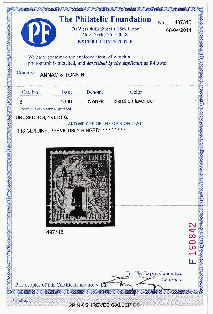 | Zusatzinformationen und Suchstichworte: | Robert A. Siegel - Worldwide Stamps and Postal History Auktionstermin: 21. - 23. Juni 2022 Los 4057 Annam und Tongking ANNAM und TONKIN, 1888,1c auf 4c weinrot (8; Yvert 6). Originalgummi, bemerkenswert gut zentriert, farbfrisch, Kabinett, ein schwierige Marke anzutreffen in dieser ausgesuchten Qualität, ex Wyer, signiert Calves und mit 2011 P. F. Attest, Scott $525,00, Yvert € 600 Ausruf 200,00 USD |