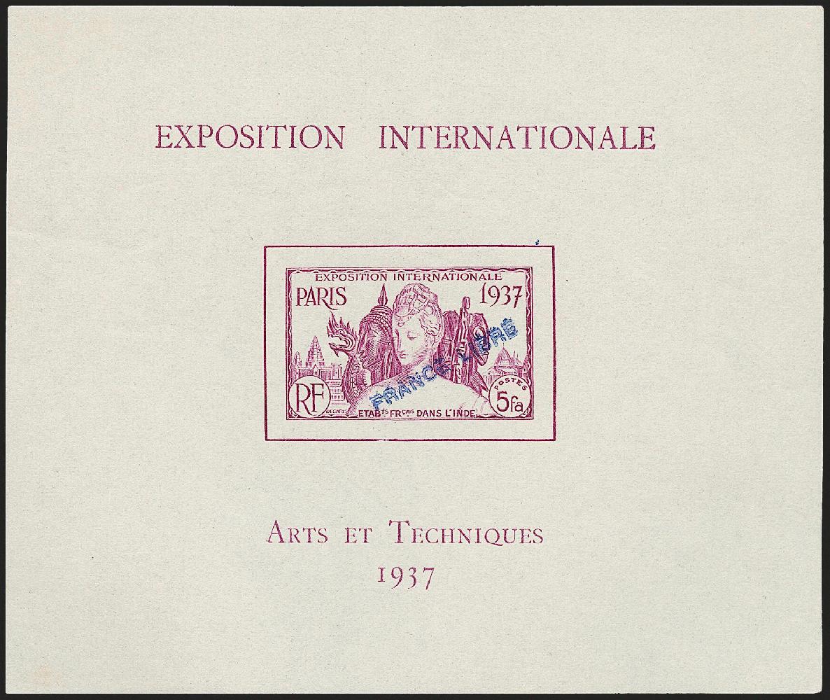 | Zusatzinformationen und Suchstichworte: | Robert A. Siegel - Worldwide Stamps and Postal History Auktionstermin: 21. - 23. Juni 2022 Los 4098 Französisch Indien Französisch Indien, 1941,5fa Paris Ausstellung mit "Frankreich Libre" Überdruck, Block (140a; Yvert BF3). Originalgummi, kleiner Falz, Pracht, nur 495 gedruckt, mit 2001 P. F. Attest, Scott $1,000,00, Yvert € 1,200 Ausruf 400,00 USD |