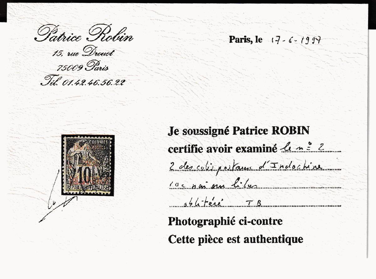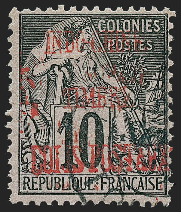 | Zusatzinformationen und Suchstichworte: | Robert A. Siegel - Worldwide Stamps and Postal History Auktionstermin: 21. - 23. Juni 2022 Los 4838 Französisch Indochina Allgemeine Ausgaben NDO-CHINA, 1891,10c schwarz, Paketpost, zinnober Handstempel in blank Tinte (Q1 var; Yvert CP2). Tieffarbig, zarter Kreisdatumsstempel Stempel, frisches und feines Stück dieser seltenen Marke, signiert J-F Brun und mit 1998 P. Robin Attest, mit Fußnote in Scott aber ohne Preis gebraucht, Yvert € 950 Ausruf 200,00 USD |