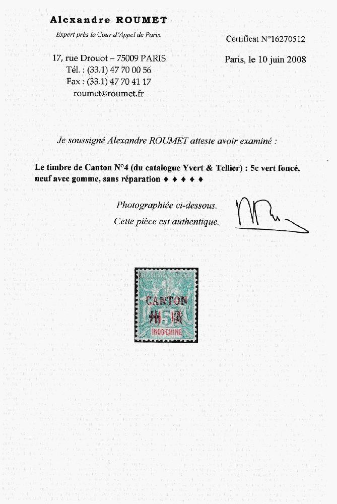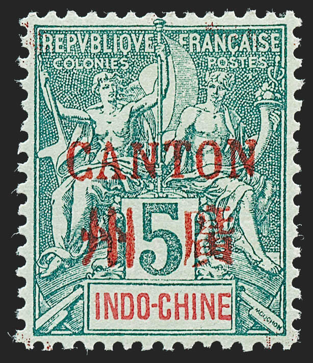 | Zusatzinformationen und Suchstichworte: | Robert A. Siegel - Worldwide Stamps and Postal History Auktionstermin: 21. - 23. Juni 2022 Los 4006 Französisch Indochina Südchina: Canton Frankreich, Post in China, Kanton, 1901,5c grün auf grünlich (2A; Yvert 4). Originalgummi, kleiner Falz, ungewöhnlich gut zentriert, tiefe, kräftige Farbe, Kabinett, ein Kabinettstück des Schlüsselstempel zu der Satz, mit 2008 Scheller und Roumet Zertifikaten, Scott $600,00, Yvert € 750 Ausruf 300,00 USD |