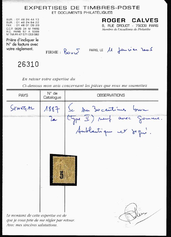 | Zusatzinformationen und Suchstichworte: | Robert A. Siegel - Worldwide Stamps and Postal History Auktionstermin: 21. - 23. Juni 2022 Los 4207 Senegal SENEGAL, 1887,5c auf 30c braun auf ockerbraun, Ty. "d" Aufdruck (8; Yvert 2A). Originalgummi, ungewöhnlicher gut zentriert, farbfrisch, Kabinetterhaltung, mit 2005 Calves Attest, Scott $475,00, Yvert € 600 Ausruf 200,00 USD |