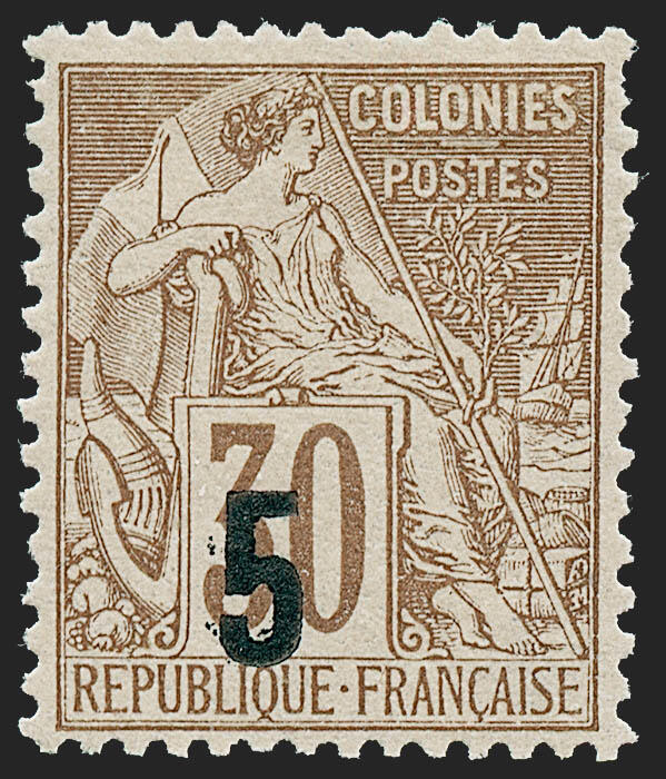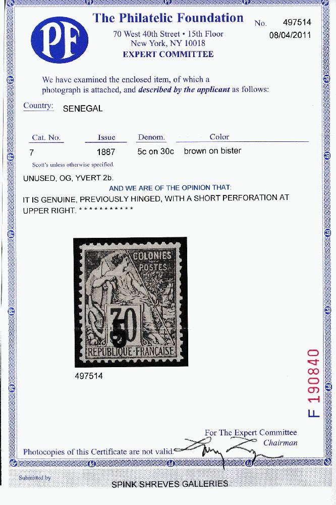 | Zusatzinformationen und Suchstichworte: | Robert A. Siegel - Worldwide Stamps and Postal History Auktionstermin: 21. - 23. Juni 2022 Los 4206 Senegal SENEGAL, 1887,5c auf 30c braun auf ockerbraun, Ty. "b" Aufdruck (7; Yvert 2B). Originalgummi, kräftige Farbe, einzeln kurzer Zahn oben rechts, ansonsten Pracht, ex Wyer, signiert Roumet und Calves, mit 1998 Behr und 2011 P. F. Zertifikaten, Scott $1,500,00, Yvert € 1,900 Ausruf 300,00 USD |