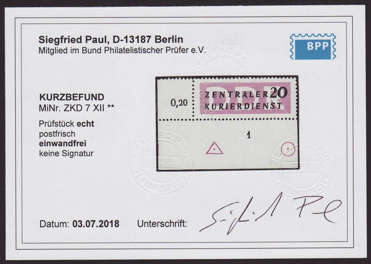 | Zusatzinformationen und Suchstichworte: | Christian E. Geigle Briefmarkenfachhandel Los 0003439200 DDR Verwaltungspost B Zentraler Kurierdienst 1956, Dienstmarken für den ZKD (II), 20 Pf. mittelviolettpurpur/schwarz, postfrisches Luxusstück dieser seltenen Marke, an deren Stelle meist der Nachdruck Mi.-Nr. 7 N enthalten ist, aus der linken unteren Bogenecke, auch die Ränder tadellos postfrisch, in dieser Form nicht häufig, unsigniert mit FKB Paul "einwandfrei". Festpreis 155,00 EUR |