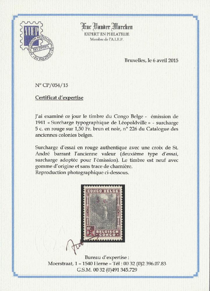 | Zusatzinformationen und Suchstichworte: | 171. Van Looy Auktion Auktionstermin: 15. - 18. Juni 2022 Los 2009 Belgisch-Kongo "Type 226, aangenomen proef van opdruk "5c. op 1,50c. karmijn en zwart" **, rode opdruk met kruis, roest met certificaat, zm/m/ntz " Zuschlag 40,00 EUR |