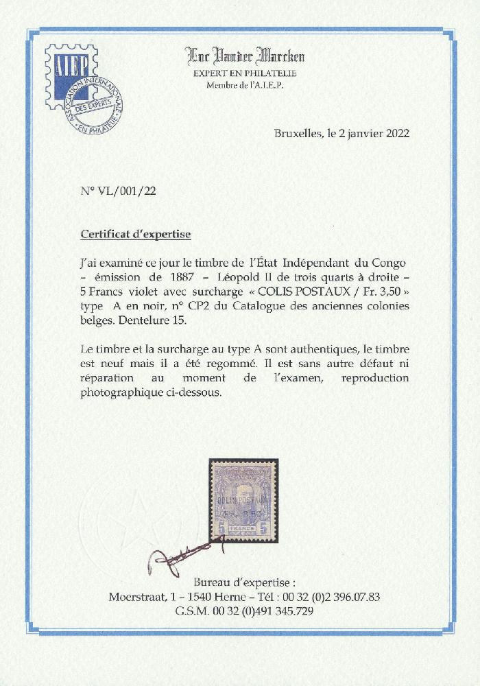| Zusatzinformationen und Suchstichworte: | 171. Van Looy Auktion Auktionstermin: 15. - 18. Juni 2022 Los 1978 Belgisch-Kongo "CP 2 "5fr. violet" met zwartgrijze opdruk "3,5fr.", zeer mooie centrage, diverse keurmerken en hergomd doch zeer zeldzaam met fotocertificaat Vander Marcken, m (OBP €2.100)" Zuschlag 270,00 EUR |