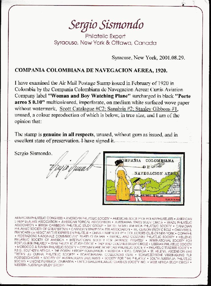 | Zusatzinformationen und Suchstichworte: | Robert A. Siegel - Worldwide Stamps and Postal History Auktionstermin: 21. - 23. Juni 2022 Los 4745 Scadta Kolumbien, 1920, 10c "SCADTA", Frau und Junge beobachtet Flugzeug (C2). Ohne Gummi, wie verausgabt, breite Ränder, leuchtende Farben Pracht und selten. Nur 38 ungebraucht sind bekannt. Mit 1997 Robineau, 2001 Sismondo, und 2002 P. F. Zertifikaten. Scott $4,500,00. vom Kofferträger W. Venn II Bestand Ausruf 1.500,00 USD |