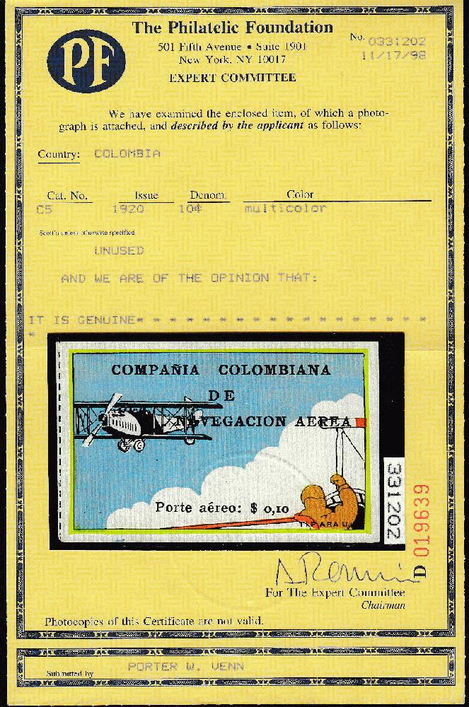 | Zusatzinformationen und Suchstichworte: | Robert A. Siegel - Worldwide Stamps and Postal History Auktionstermin: 21. - 23. Juni 2022 Los 4748 Scadta Kolumbien, 1920, 10c "SCADTA", Infoblatt in flach zuschauend Doppeldecker (C5). Ohne Gummi, wie verausgabt, besonders breite Ränder, kräftige Farben auf frischem Papier Kabinett. Ein wunderbar selten und begehrenswert Luftpostmarke. Nur 53 ungebraucht bekannt sind. Mit 1998 P. F. Attest. Scott $4,500,00. vom Kofferträger W. Venn II Bestand Ausruf 1.500,00 USD |