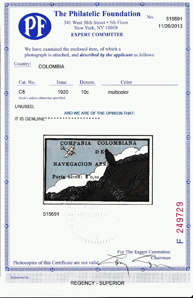 | Zusatzinformationen und Suchstichworte: | Robert A. Siegel - Worldwide Stamps and Postal History Auktionstermin: 21. - 23. Juni 2022 Los 4751 Scadta Kolumbien, 1920, 10c "SCADTA", Condor auf Klippe (C8). Ohne Gummi, wie verausgabt, breite Ränder zu reichlich auf der linken Seite welches ist weites größer als typisch gesichtet, frische Farben Kabinetterhaltung. Nur 36 ungebrauchte Stücke von dieser Luftpostmarke sind bekannt, und dieses ist IN weites bessere Erhaltung als typisch traf. Mit 1976 Friedl und 2013 P. F. Zertifikaten. Scott $8,000,00. vom Kofferträger W. Venn II Bestand Ausruf 3.000,00 USD |