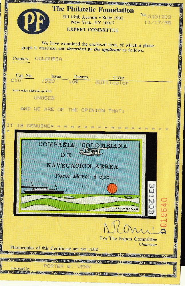 | Zusatzinformationen und Suchstichworte: | Robert A. Siegel - Worldwide Stamps and Postal History Auktionstermin: 21. - 23. Juni 2022 Los 4753 Scadta Kolumbien, 1920, 10c "SCADTA", Ozean Linienschiff (C10). Ohne Gummi, wie verausgabt, breite Ränder zu volles unten (größer als generell gesichtet auf dieser Marke), ausgezeichnete Farben, einige etwas aufgeraut Flecke, sehr gute Wirkung, ein besonders ungebraucht seltene Briefmarke mit nur 24 verzeichnet machend dieses sofort meiste schwierige Marke des Serien zum Erwerb, mit 1974 Friedl und 1998 P. F. Zertifikaten nicht erwähnenswert die falzdünne Flecke, Scott $6,000,00, vom Kofferträger W. Venn II Bestand Ausruf 1.000,00 USD |