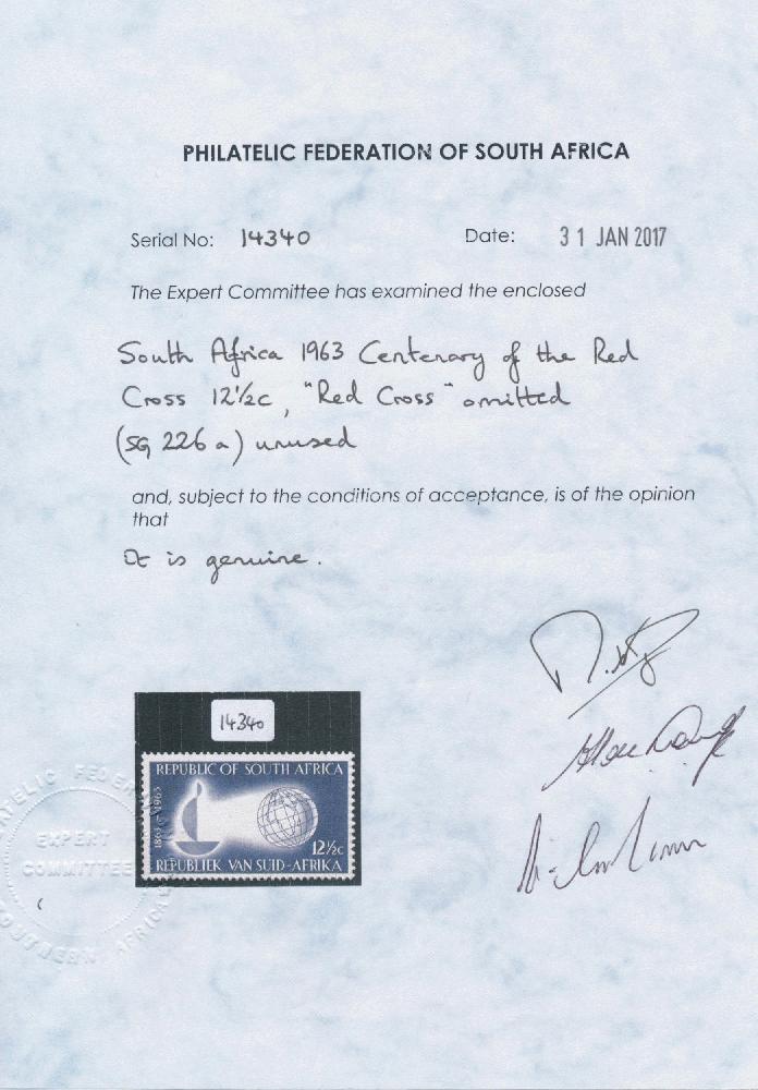 | Zusatzinformationen und Suchstichworte: | Doreen Royan & Associates Shop - Online Los 750178 (D) Südwestafrika South Africa. 1963 Centenary of Red Cross. 12½c. red and indigo. Error, ‘Red cross omitted’. Superb unmoiunted mint condition (with normal for comparison). Philatelic Federation of South Africa Certificate No. 14,340 (2017). EXCEPTIONALLY RARE. QUANTITY – CIRCA 12 mint, 2 used. (SACC 225a) Preis auf Anfrage |