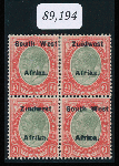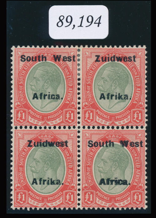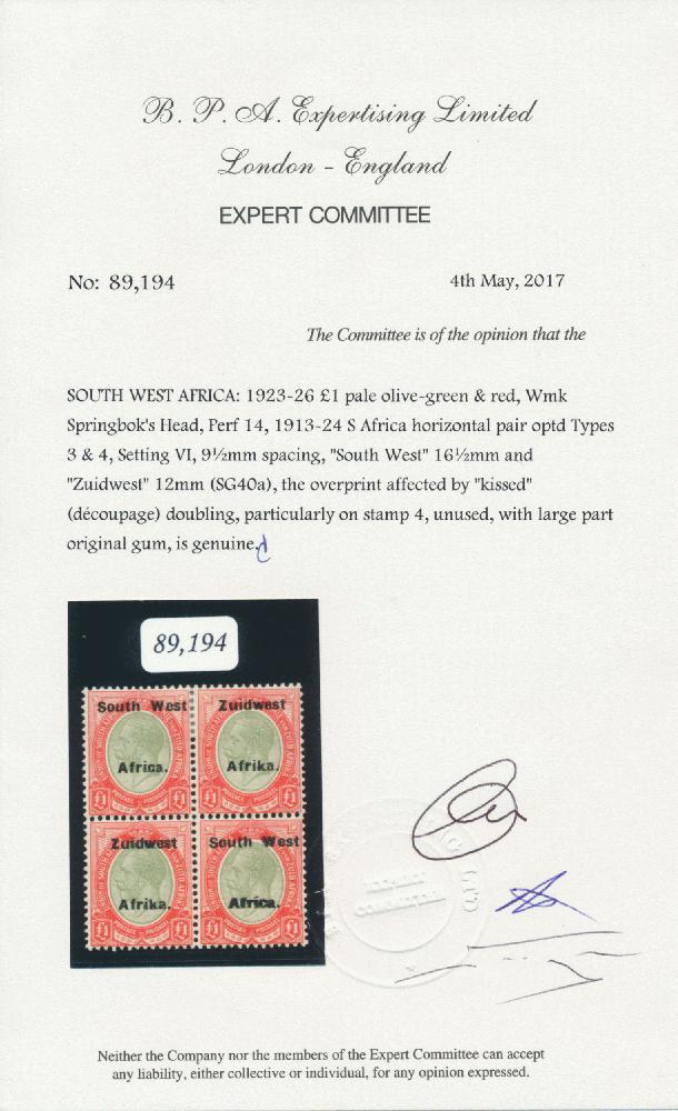 | Zusatzinformationen und Suchstichworte: | Doreen Royan & Associates Shop - Online Los 500111 (D) Südwestafrika South West Africa. 1926 King George V Setting VIa £1 pale olive-green and red. Block of four. Lower right stamp has variety, ‘Africa printed double’. Overprint affected by “Kissed” doubling. Superb mint/superb unmounted mint condition (lower pair unmounted). Some split perfs at top. British Philatelic Association Certificate No. 89,194 (2017). VERY RARE. (SACC 63a var.) Preis auf Anfrage |