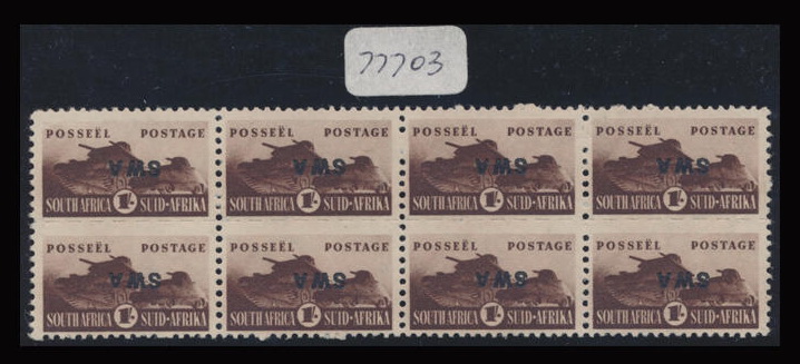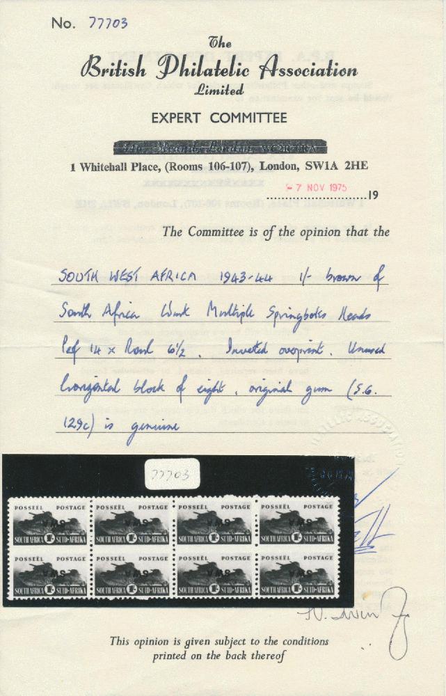 | Zusatzinformationen und Suchstichworte: | Doreen Royan & Associates Shop - Online os 750862 (D) Südwestafrika South West Africa 1942-1944 King George VI Bantam War Effort. 1/- brown. Four bi-lingual vertical pairs. Variety, ‘Overprint inverted’. Superb unmounted mint condition. British Philatelic Association Certificate No. 77,703 (1975). VERY RARE Festpreis 2.300,00 GBP |