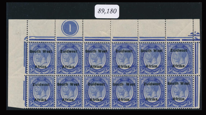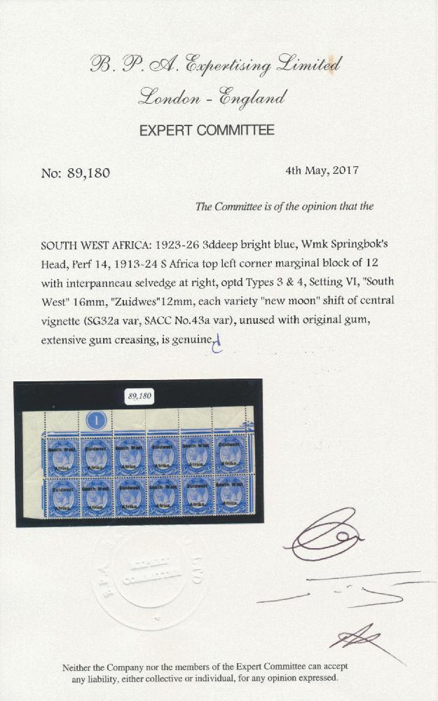 | Zusatzinformationen und Suchstichworte: | Doreen Royan & Associates Shop - Online Los 500104 (D) Südwestafrika South West Africa. 1926 King George V Setting VI 3d. deep bright blue. North West corner Plate No. 1 block of 12 with interpanneau margin at right. Variety, ‘”New moon” shifted vignettes’. Superb unmounted mint condition with some gum creasing. British Philatelic Association Certificate No. 89, 180 (2017). EXCEEDINGLY RARE. (SACC 43a) Preis auf Anfrage |