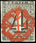 | Zusatzinformationen und Suchstichworte: | Dr. Reinhard Fischer 186. Auktion Auktionstermin: 18. - 21. Mai 2022 Los 4965 Schweiz Kanton Zürich 1843, 4 Rappen schwarz, waagerechte rote Unterdrucklinien, zentrisch entwertet mit roter Zürcher Rosette, gepr. Estoppey mit Fotoattest und Fotoattest Rellstab: "Sauber und sehr farbfrische Marke mit gut sichtbaren Unterdrucklinien, oben an die Randlinie geschnitten, breiter Rand an drei Seiten mit den Trennungslinien, die satt und zentrisch aufgesetzte Rosette wirkt dekorativ; oben rechts leichter und unbedeutender Eckbug , soweit in guter Erhaltung." - ein tolles Stück der seltenen Marke! (Zumstein 1W Type V) Zuschlag 4.900,00 EUR |