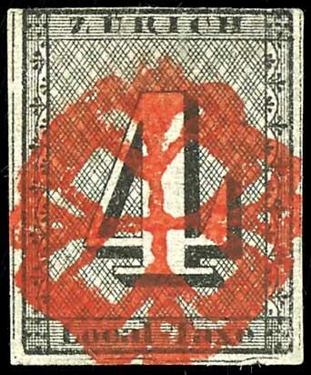 | Zusatzinformationen und Suchstichworte: | Dr. Reinhard Fischer 186. Auktion Auktionstermin: 18. - 21. Mai 2022 Los 4965 Schweiz Kanton Zürich 1843, 4 Rappen schwarz, waagerechte rote Unterdrucklinien, zentrisch entwertet mit roter Zürcher Rosette, gepr. Estoppey mit Fotoattest und Fotoattest Rellstab: "Sauber und sehr farbfrische Marke mit gut sichtbaren Unterdrucklinien, oben an die Randlinie geschnitten, breiter Rand an drei Seiten mit den Trennungslinien, die satt und zentrisch aufgesetzte Rosette wirkt dekorativ; oben rechts leichter und unbedeutender Eckbug , soweit in guter Erhaltung." - ein tolles Stück der seltenen Marke! (Zumstein 1W Type V) Zuschlag 4.900,00 EUR |