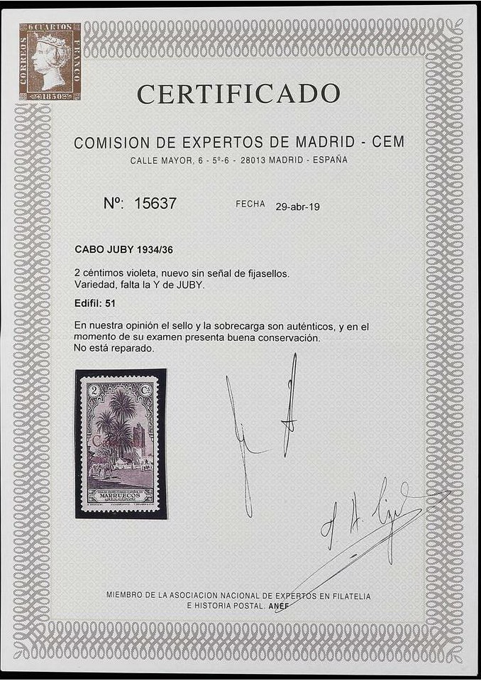 | Zusatzinformationen und Suchstichworte: | Soler y Llach - 778. Auktion - Spanien und Kolonien Auktionstermin: 14. Juli 2022 Los 829 Kap Jubi COLONIAS ESPAÑOLAS: CABO JUBY. 2 cts. violeta. Falta la ´Y´ de ´JUBY´. No reseñado. MUY RARO. Cert. CEM. Ed.51. Ausruf 150,00 EUR |