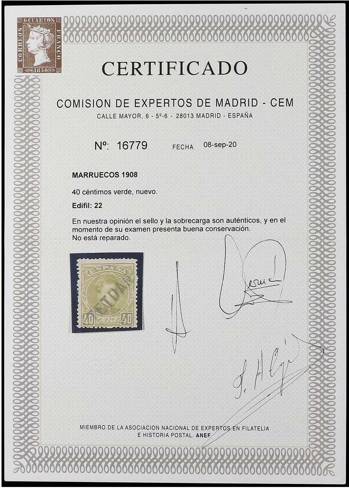 | Zusatzinformationen und Suchstichworte: | Soler y Llach - 778. Auktion - Spanien und Kolonien Auktionstermin: 14. Juli 2022 Los 895 Spanisch Marokko COLONIAS ESPAÑOLAS: MARRUECOS. 40 cts. oliva, habilitación TETUAN en azul. MAGNÍFICO y MUY RARO en esta calidad. Cert. CEM. Ed.22. Ausruf 275,00 EUR |