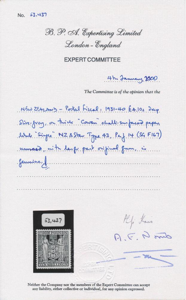 | Zusatzinformationen und Suchstichworte: | Doreen Royan & Associates Shop - Online Los 750896 (D) Neuseeland New Zealand 1935 King George V Postal Fiscal £4.10/- deep olive-grey. On thick, opaque, chalk-surfaced paper. Watermark SG Type 43. Superb mint condition. British Philatelic Association Expertising Certificate No. 53,437 (2000). EXCEEDINGLY RARE Festpreis 2.500,00 GBP |