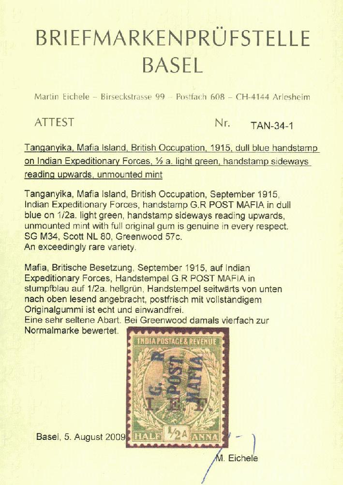 | Zusatzinformationen und Suchstichworte: | 73. AAK Phila GmbH Auktion Auktionstermin: 7. Mai 2022 Los 1221 (D) Tanganjika Besetzung Mafia Insel 1/2 A gelbgrün m. senkr. Handstpl.-Aufdruck, postfr. Luxus, sign. u. m. einwandfreiem Attest BPSB "sehr seltene Abart, bei Greenwood x4 bewertet!", RR, Michel-Notierungen nicht realistisch! Ausruf 250,00 EUR |