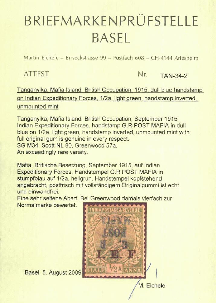 | Zusatzinformationen und Suchstichworte: | 73. AAK Phila GmbH Auktion Auktionstermin: 7. Mai 2022 Los 1222 (D) Tanganjika Besetzung Mafia Insel 1/2 A gelbgrün m. kopfsteh. Handstpl.-Aufdruck, postfr. Luxus, sign. u. m. einwandfreiem Attest BPSB "sehr seltene Abart, bei Greenwood x4 bewertet!", RR, Michel-Notierungen nicht realistisch! Ausruf 500,00 EUR |