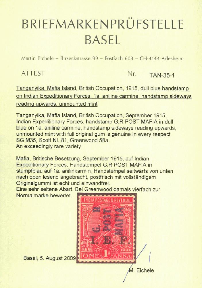 | Zusatzinformationen und Suchstichworte: | 73. AAK Phila GmbH Auktion Auktionstermin: 7. Mai 2022 Los 1224 (D) Tanganjika Besetzung Mafia Insel 1 A karminrosa m. senkr. Handstpl.-Aufdruck, postfr. Luxus, sign. u. m. einwandfreiem Attest BPSB "sehr seltene Abart, bei Greenwood x4 bewertet!", RR, Michel-Notierungen nicht realistisch! Ausruf 250,00 EUR |