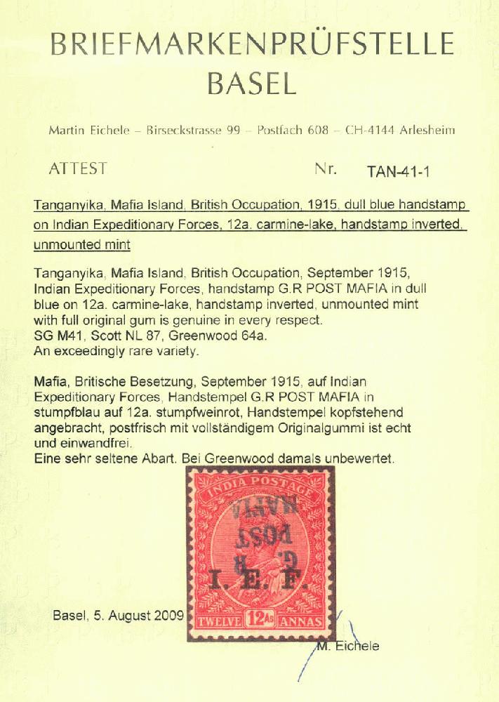 | Zusatzinformationen und Suchstichworte: | 73. AAK Phila GmbH Auktion Auktionstermin: 7. Mai 2022 Los 1232 (D) Tanganjika Besetzung Mafia Insel 12 A braunkarmin m. kopfsteh. Handstpl.-Aufdruck, postfr. Luxus, sign. u. m. einwandfreiem Attest BPSB "sehr seltene Abart, bei Greenwood unterbewertet!", RR, Michel-Notierungen nicht realistisch! Ausruf 500,00 EUR |