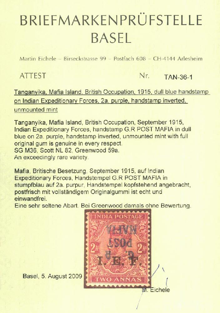 | Zusatzinformationen und Suchstichworte: | 73. AAK Phila GmbH Auktion Auktionstermin: 7. Mai 2022 Los 1226 (D) Tanganjika Besetzung Mafia Insel 2 A violett m. kopfsteh. Handstpl.-Aufdruck, postfr. Luxus, sign. u. m. einwandfreiem Attest BPSB "sehr seltene Abart, bei Greenwood ohne Bewertung!!!", RR, Michel-Notierungen nicht realistisch! Ausruf 500,00 EUR |