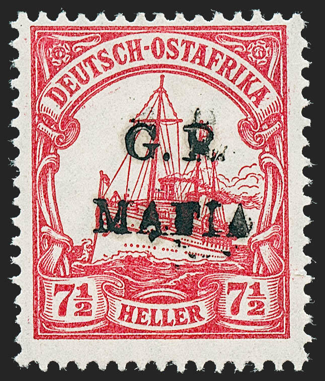 | Zusatzinformationen und Suchstichworte: | Robert A. Siegel - Worldwide Stamps and Postal History Auktionstermin: 21. - 23. Juni 2022 Los 4652 Deutsche Kolonien Ostafrika Brit. Besetzung Deutsch-Ostafrika, mafios Insel, 1915,7-1/2h karmin, Schwarzaufdruck (NL11; SG M3A). Originalgummi, minimaler Falzrest intensive Farbe, frisch und fein, mit 2014 B. P. A. Attest, Scott $625,00, SG £650 Ausruf 200,00 USD |