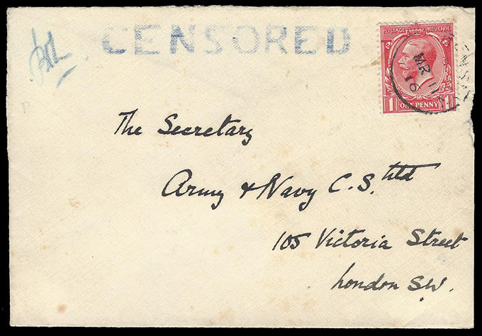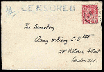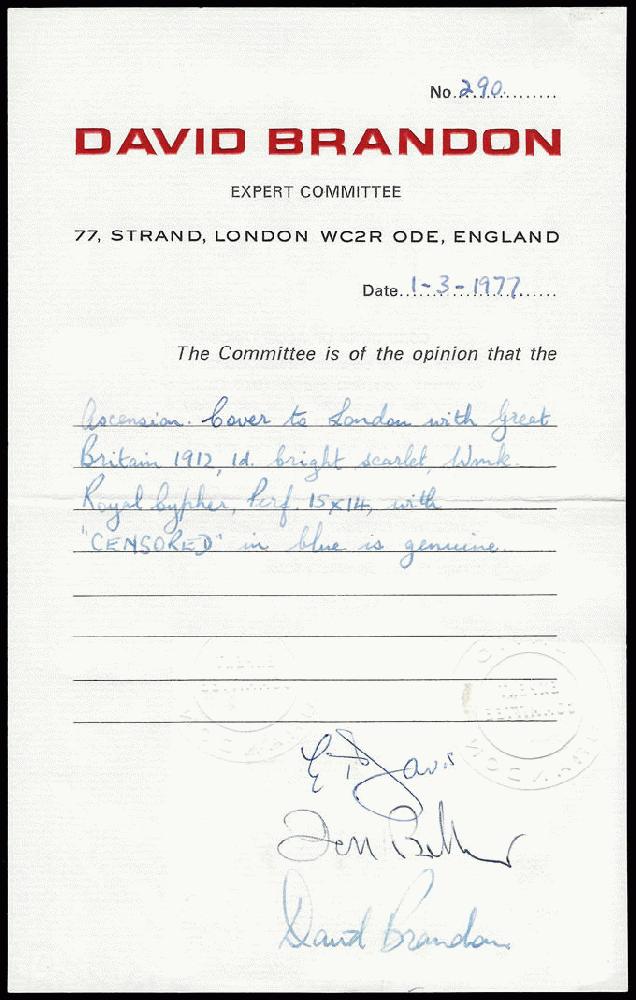 | Zusatzinformationen und Suchstichworte: | Filat AG Shop Neu Los 6049 (D) Ascension 1916 CENSORED LETTER envelope, franked GB KGV 1d, to London, the adhesive tied by Ascension cds MR 11. Bears, perfectly placed at top centre, an excellent strike in blue of the large single line CENSORED handstamp duly initialled at left. Few light tone blemishes, mainly on reverse. VF, rare, most attractive. Photo-cert: Brandon. See image of certificate below Festpreis 575,00 CHF |